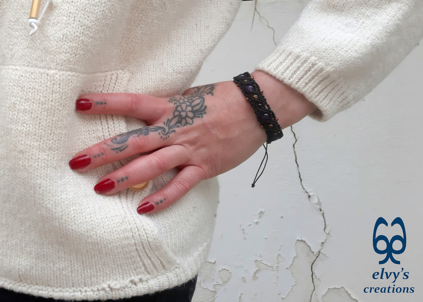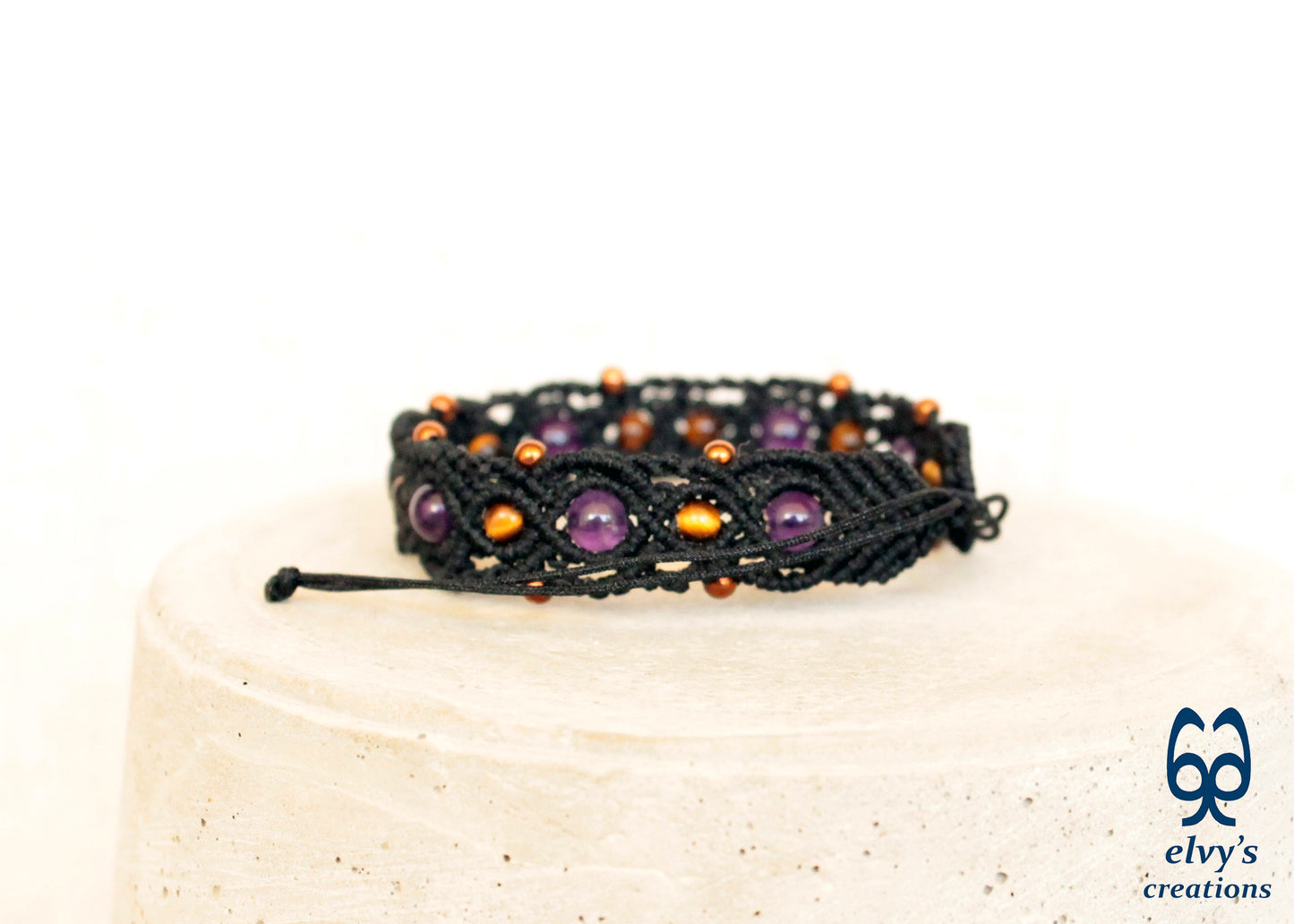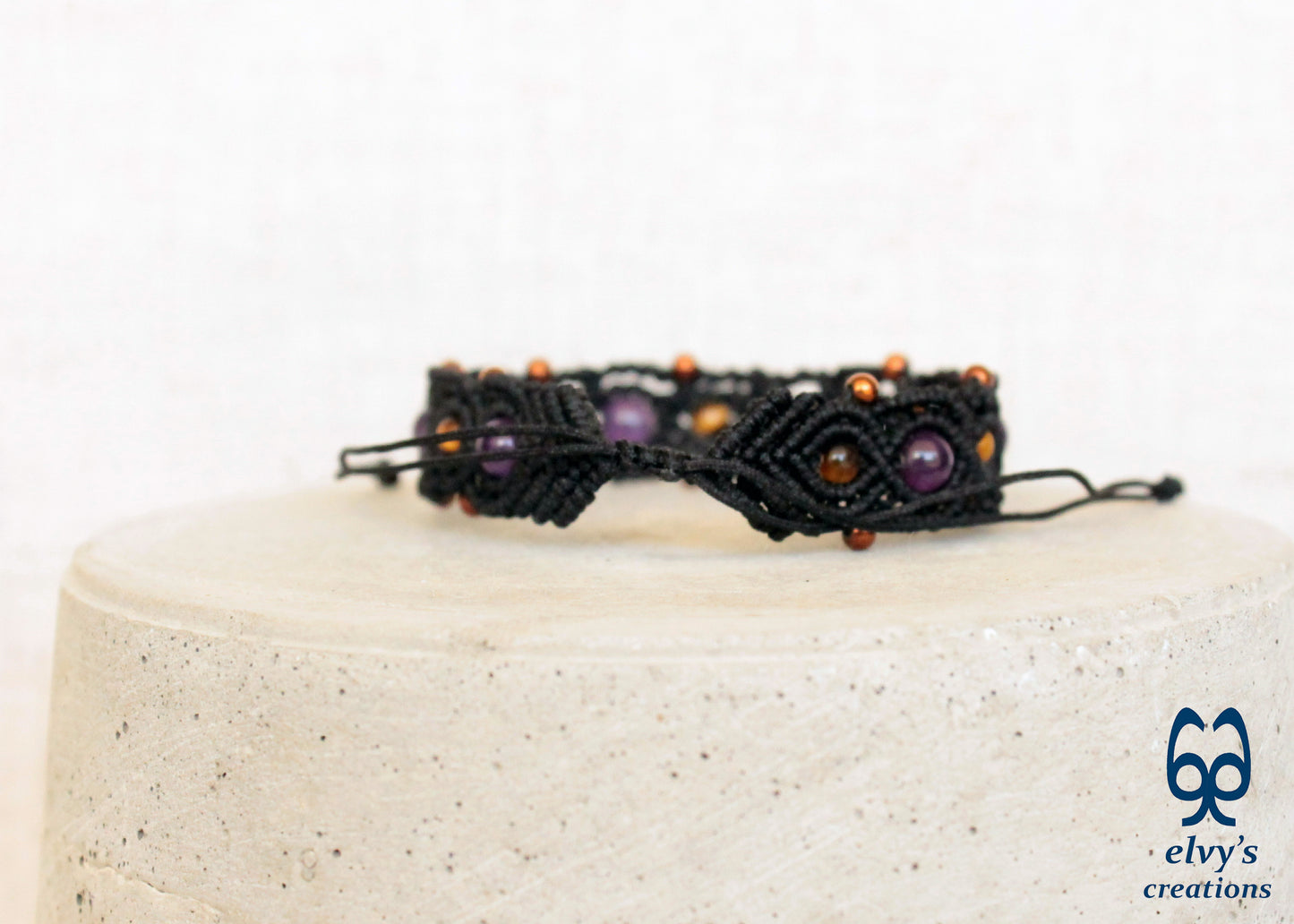 This is a handmade macrame cuff bracelet. Beautiful macrame knitting with black macrame in combination with gold, bronze and purple gemstones. This bracelet is very elegant and can be worn at all times of day with casual or formal clothes.