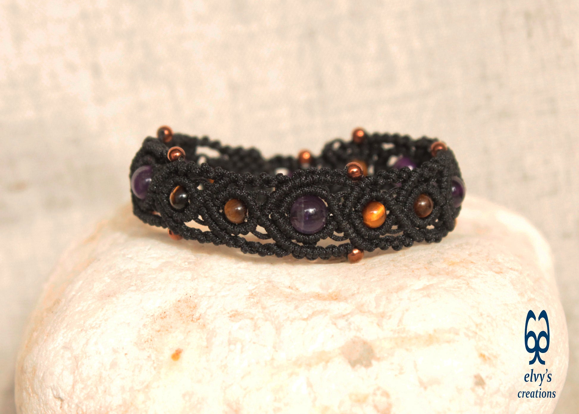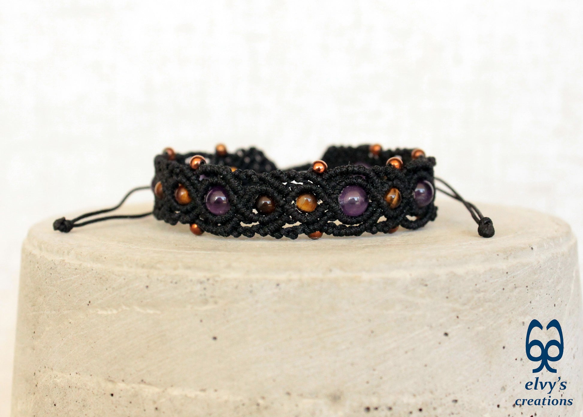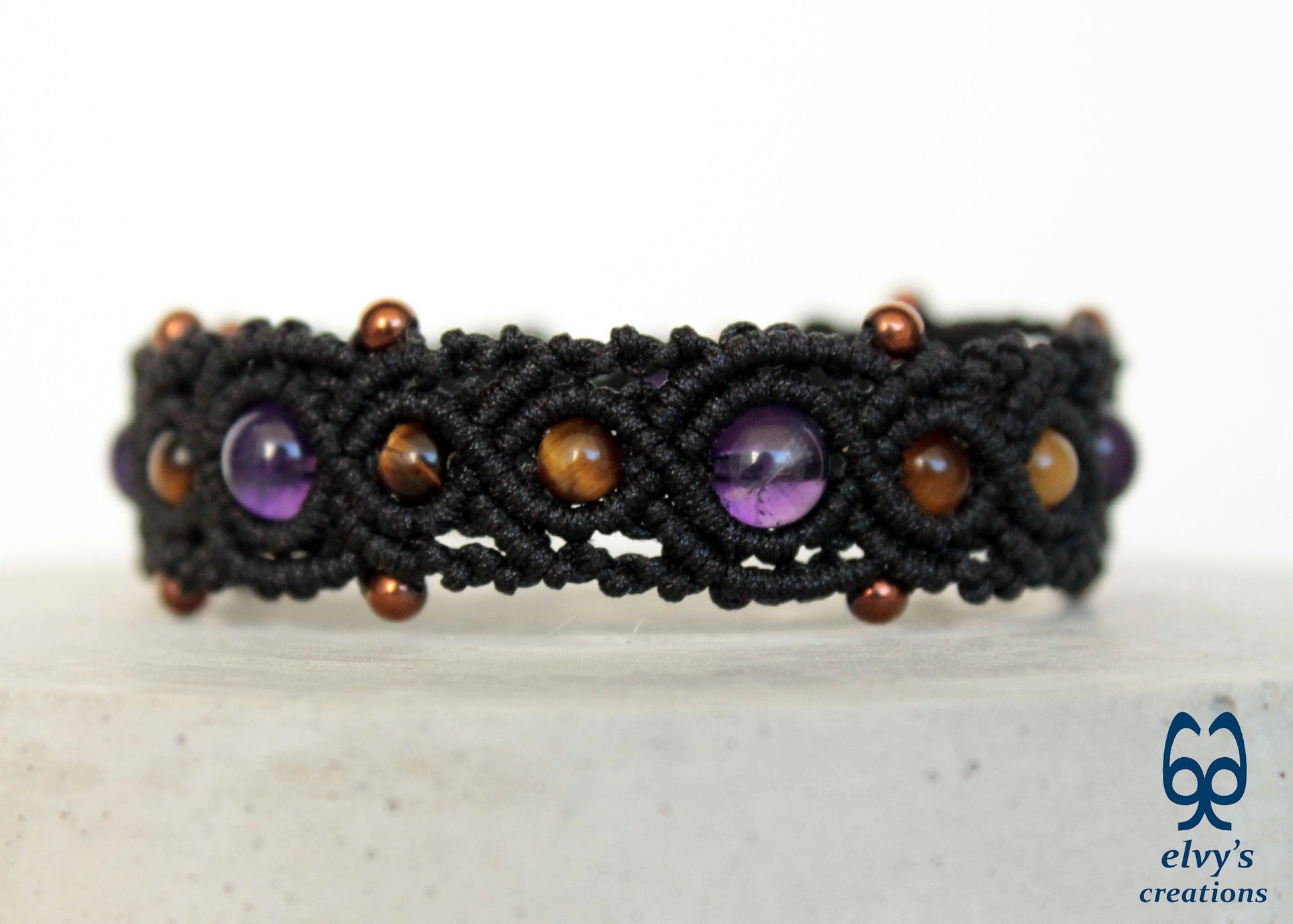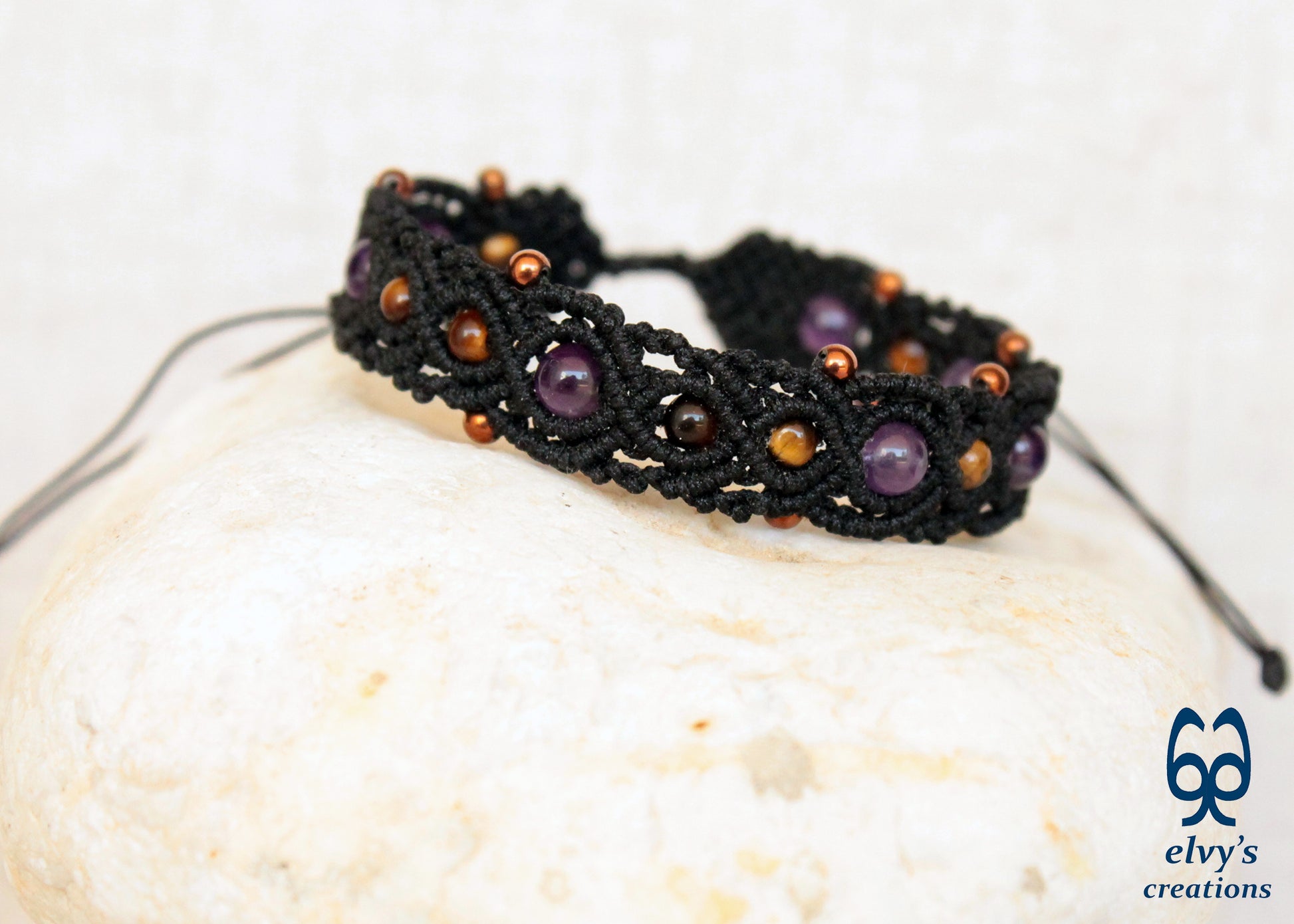 This handmade macrame bracelet is knit with black premium Dandelion cord. It holds 7 Amethyst, 9 Tiger Eye and 14 bronze Hematite gemstones.