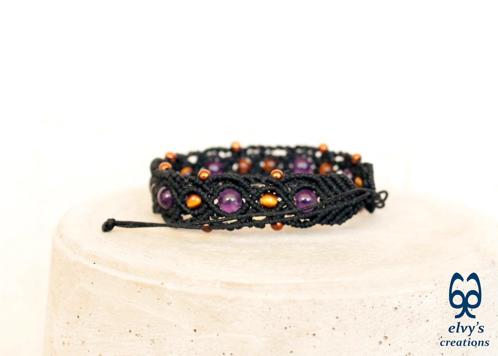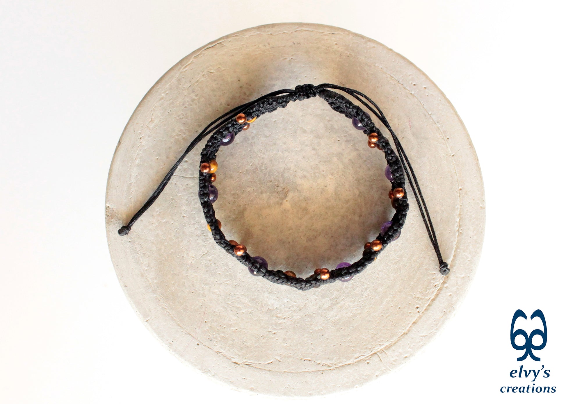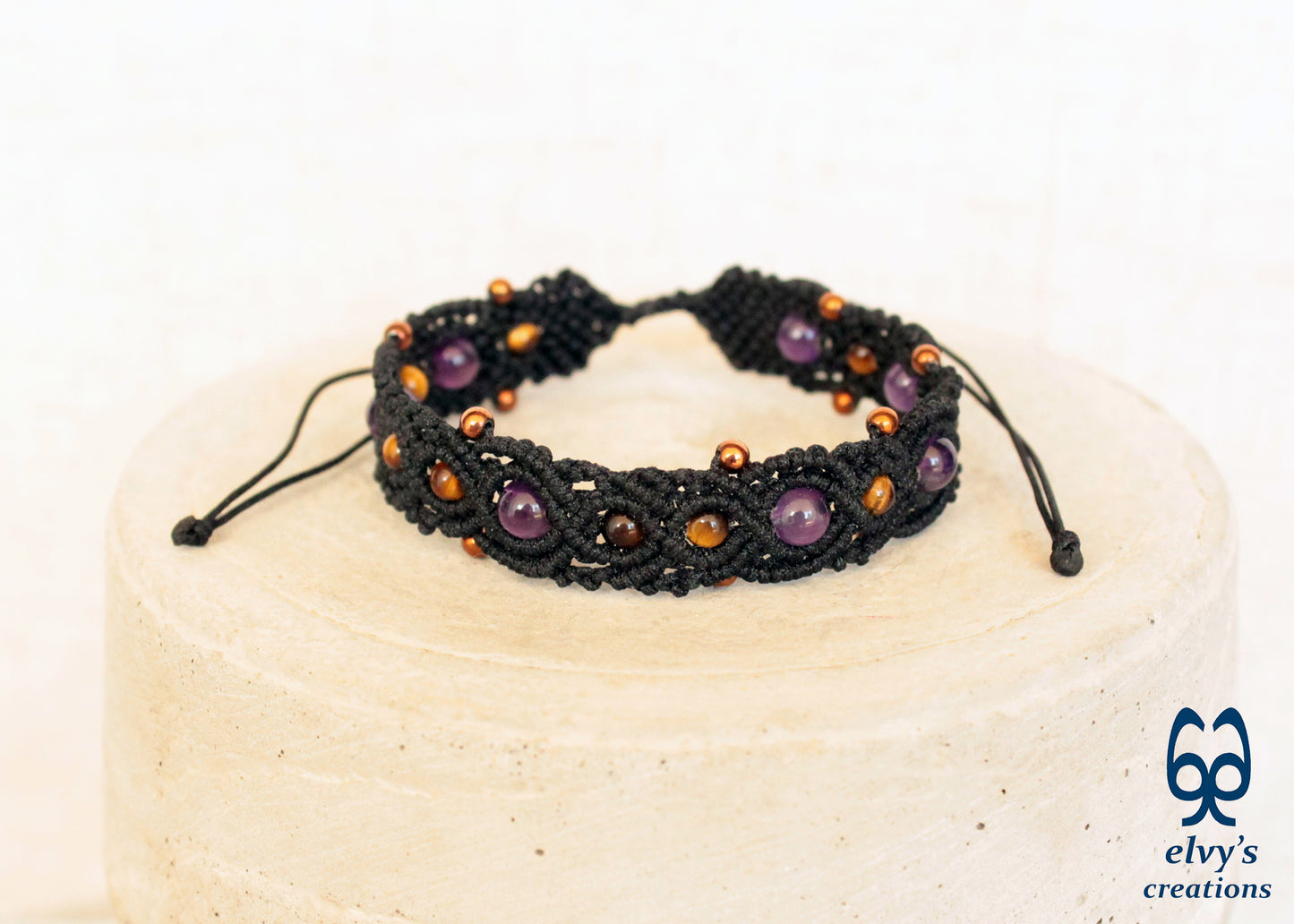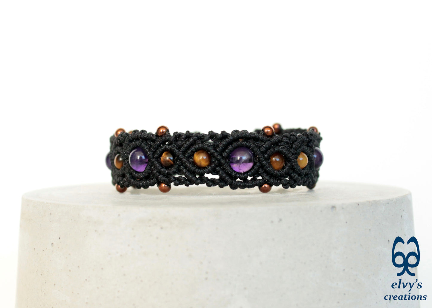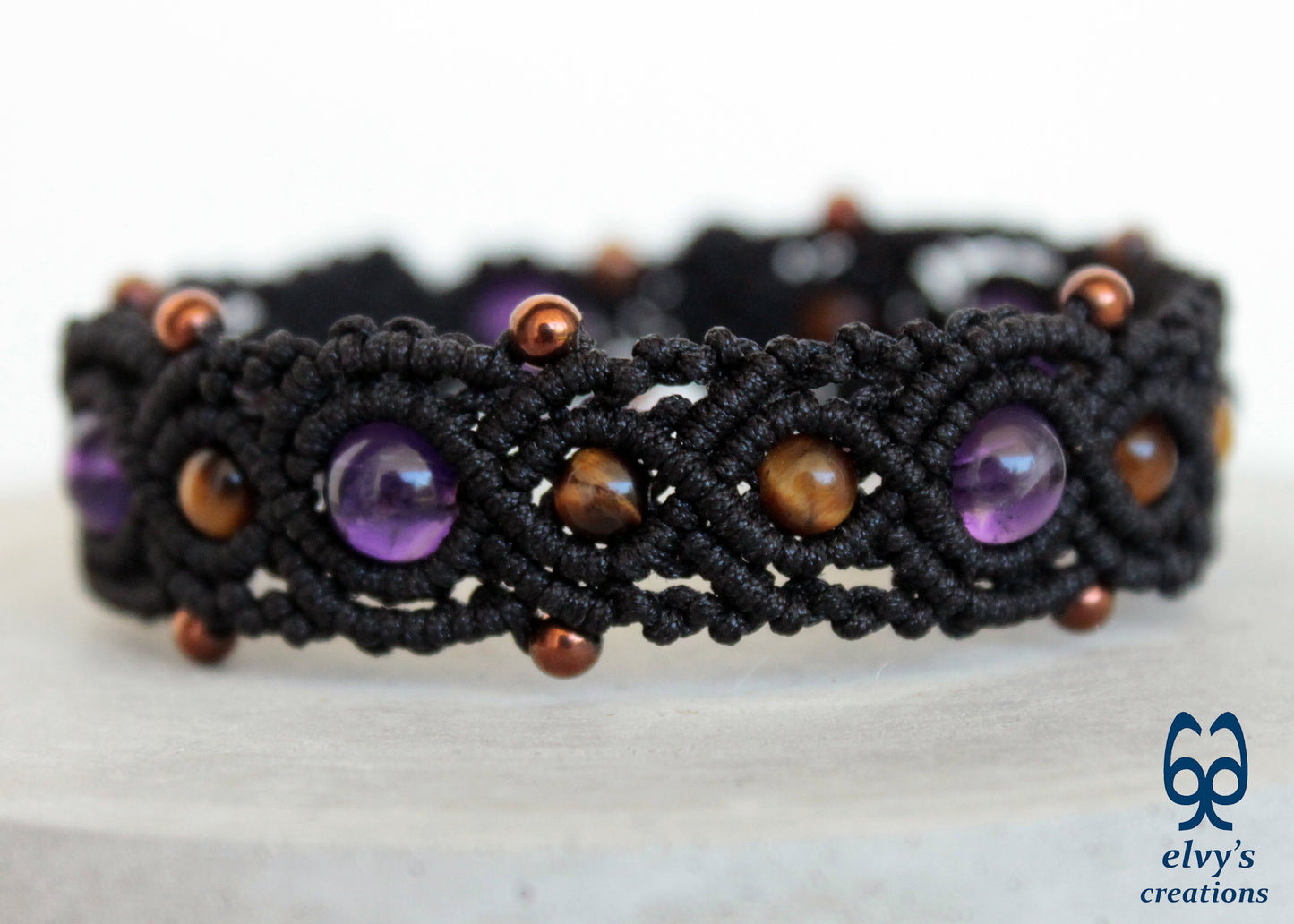 This handmade macrame bracelet is knit with black premium Dandelion cord. It holds 7 Amethyst, 9 Tiger Eye and 14 bronze Hematite gemstones.