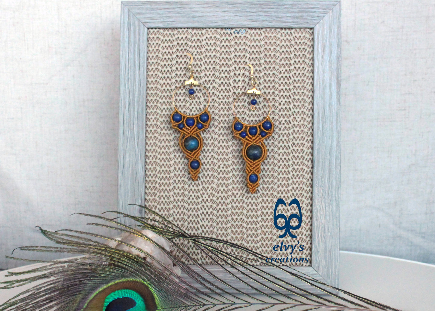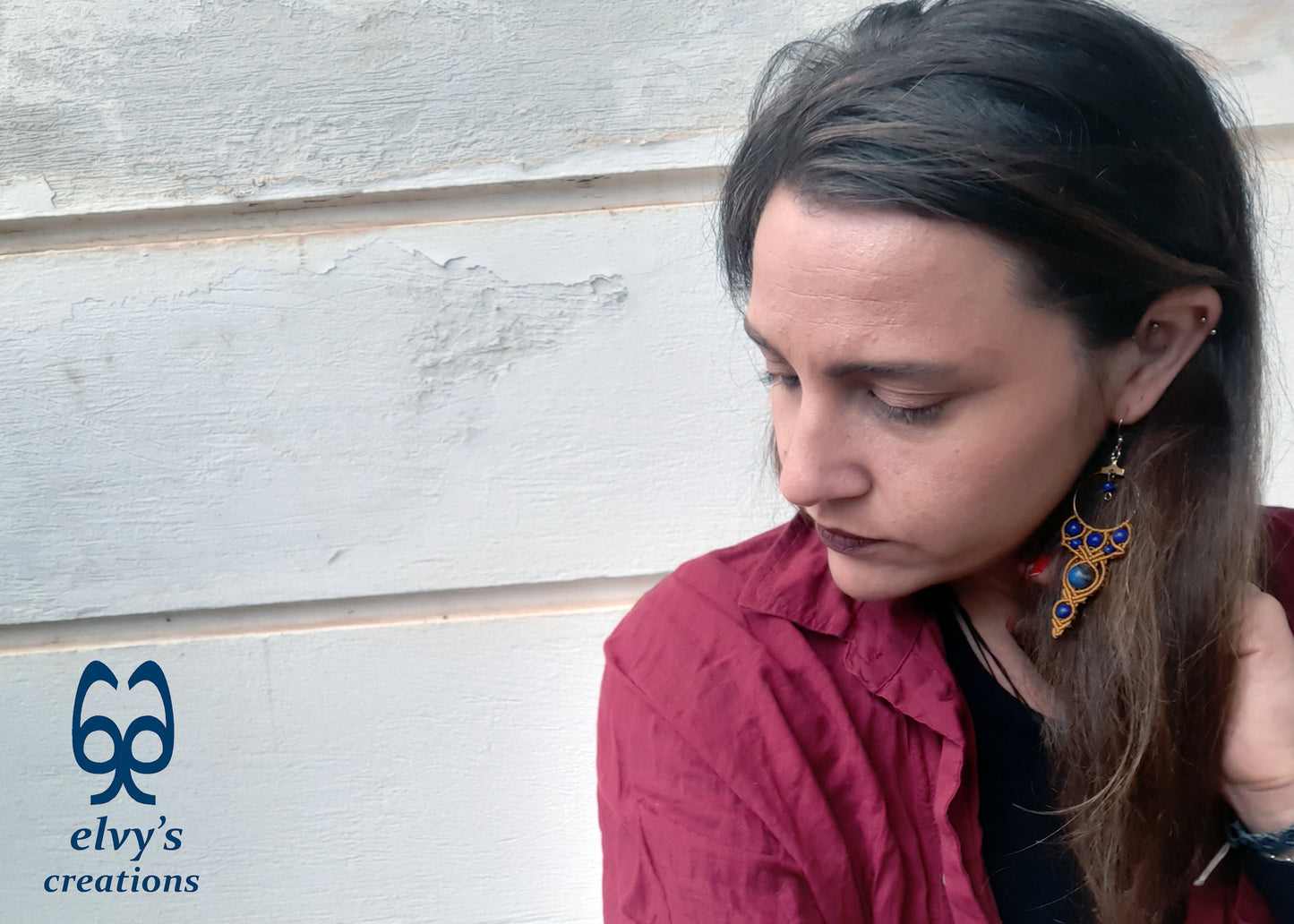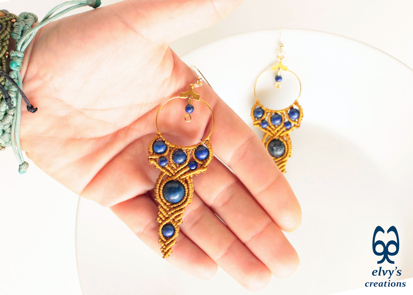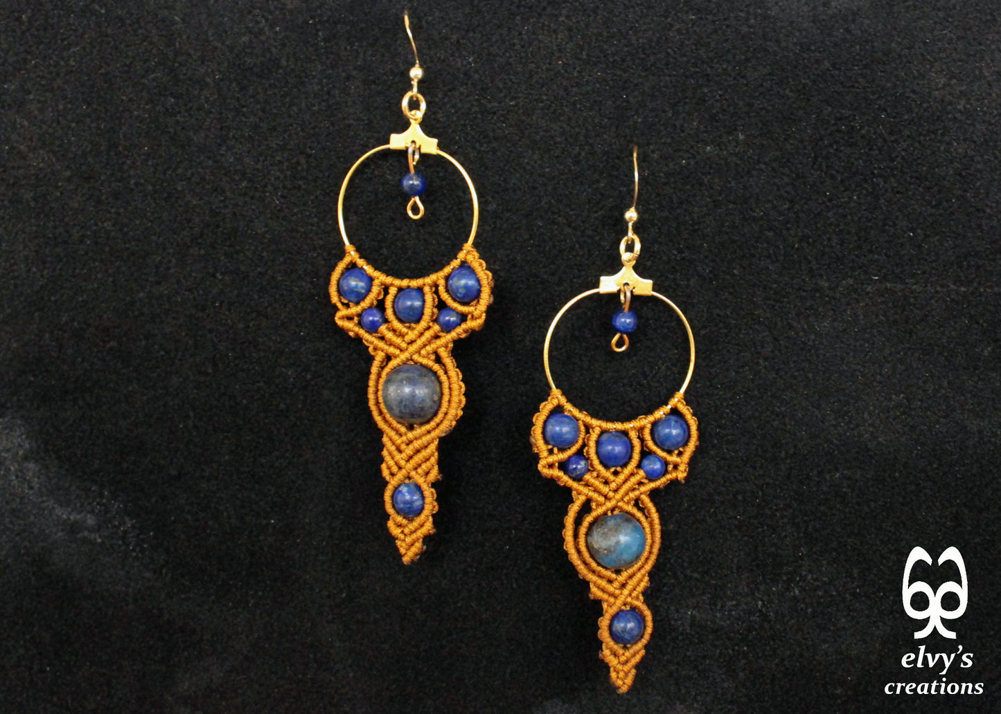 Τα χειροποίητα σκουλαρίκια είναι φτιαγμένα με αδιάβροχο χρυσό κορδόνι, χρησιμοποιώντας την τεχνική μακραμέ. Τα σκουλαρίκια είναι διακοσμημένα με Λάπις Λάζουλι. Τα στοιχεία στα σκουλαρίκια, όπως και οι γάντζοι είναι από ασήμι υποαλλεργικό.