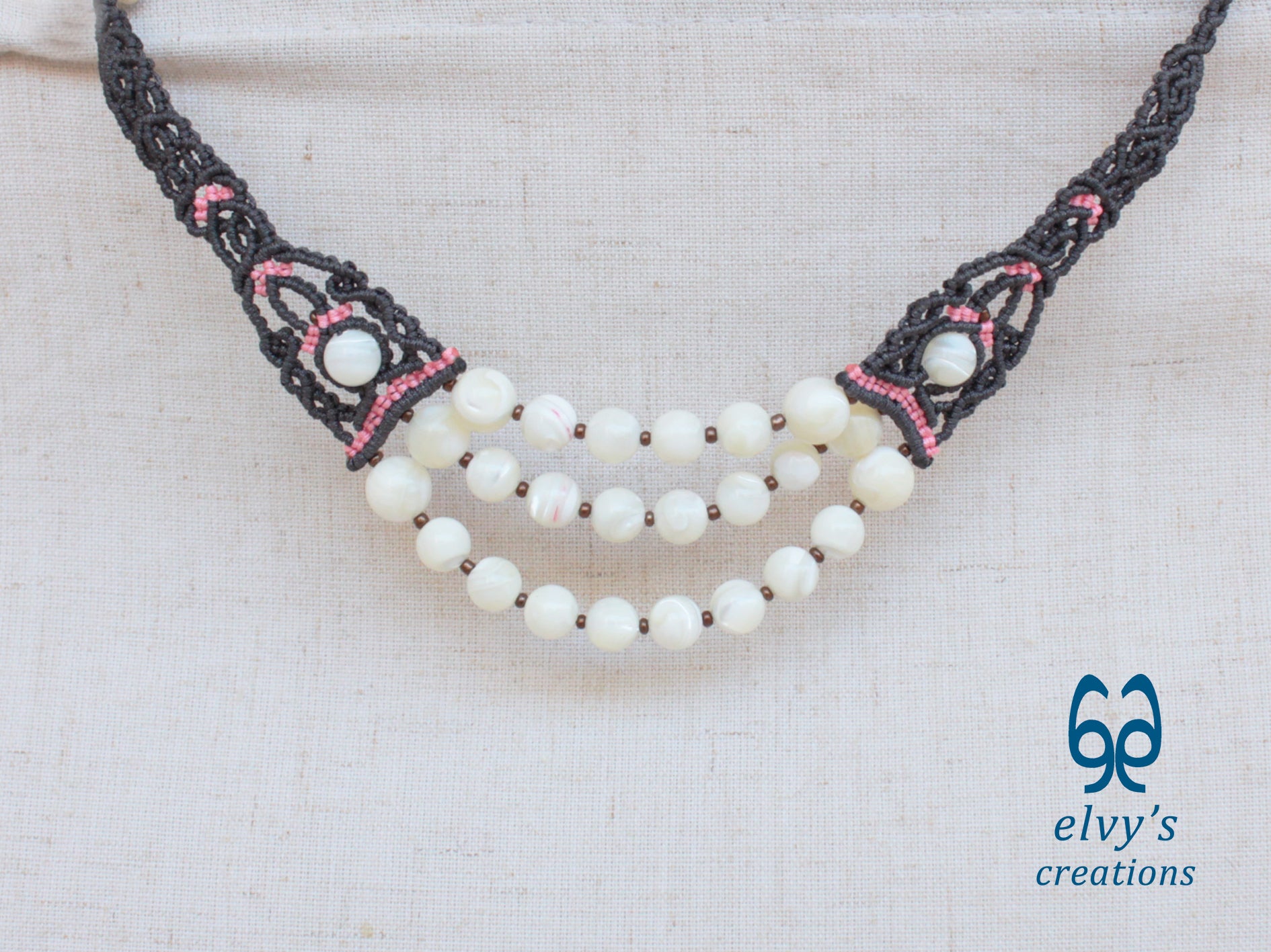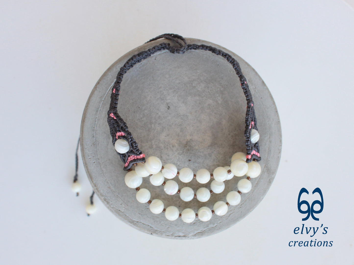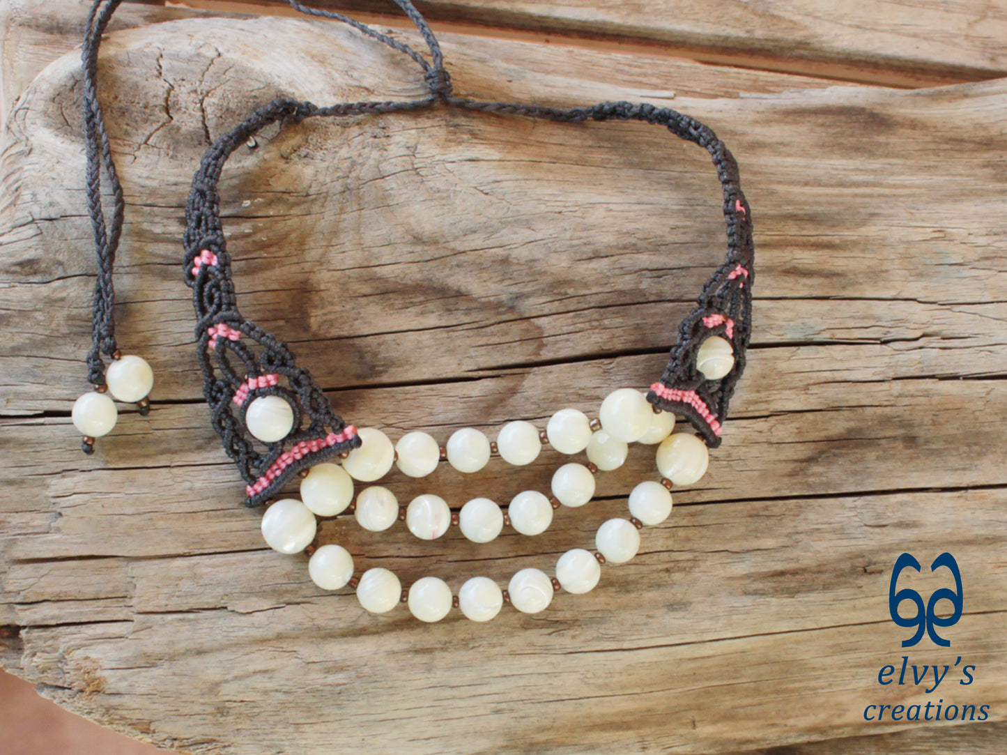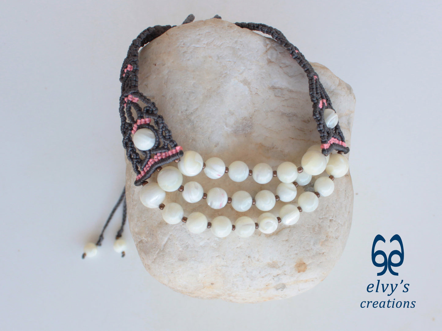 - Υλικά: Το χειροποίητο κολιέ είναι φτιαγμένο με αδιάβροχο γκρι και ροζ κορδόνια, χρησιμοποιώντας την τεχνική μακραμέ. Το κολιέ είναι διακοσμημένο με Χαλαζία (Quartz), ενώ το κούμπωμα είναι και αυτό με πλέξη μακραμέ.