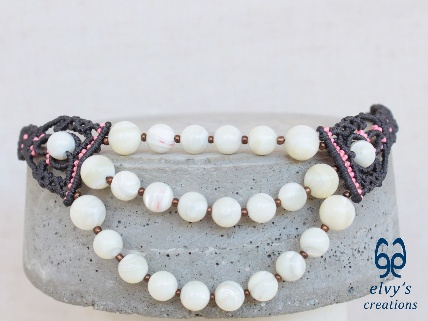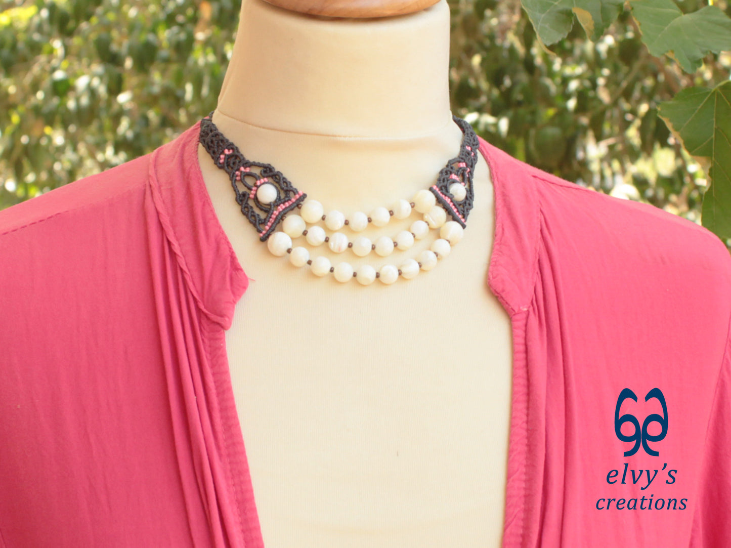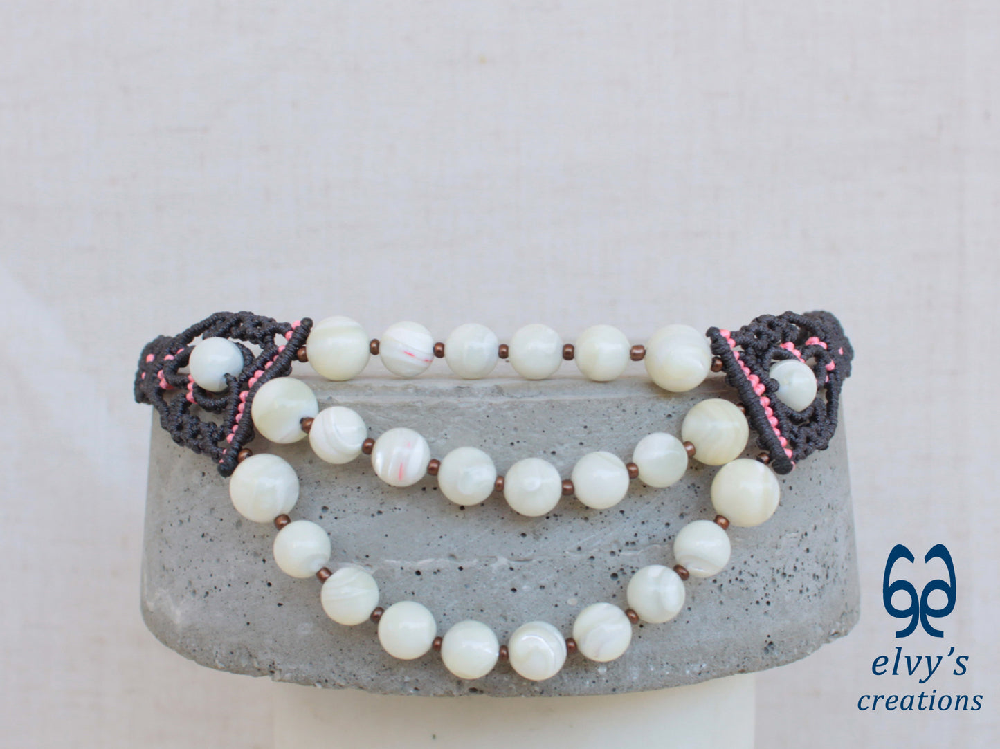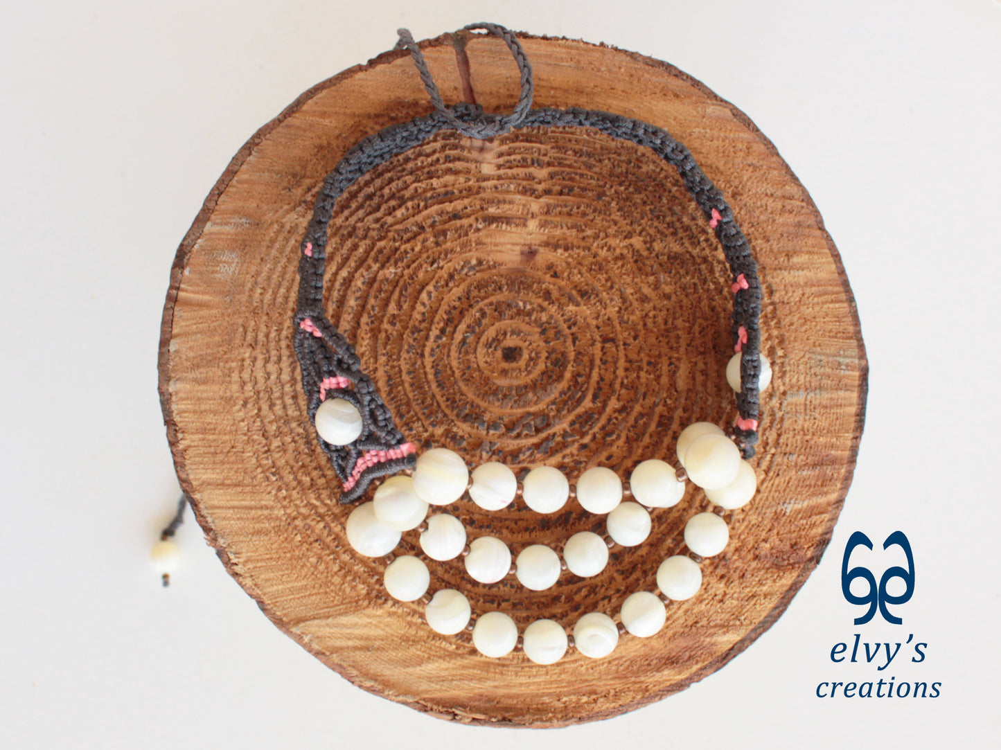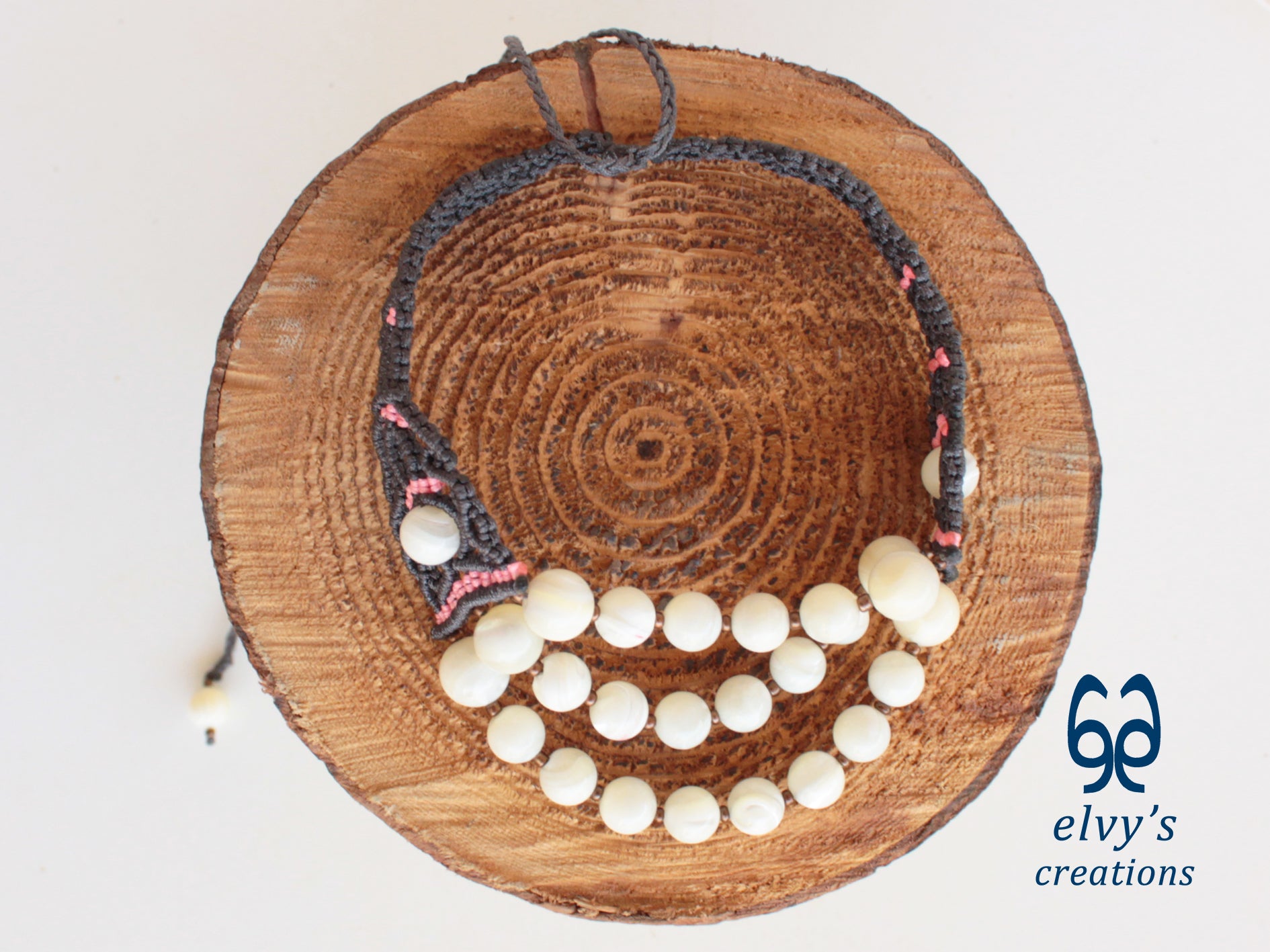 - Υλικά: Το χειροποίητο κολιέ είναι φτιαγμένο με αδιάβροχο γκρι και ροζ κορδόνια, χρησιμοποιώντας την τεχνική μακραμέ. Το κολιέ είναι διακοσμημένο με Χαλαζία (Quartz), ενώ το κούμπωμα είναι και αυτό με πλέξη μακραμέ.