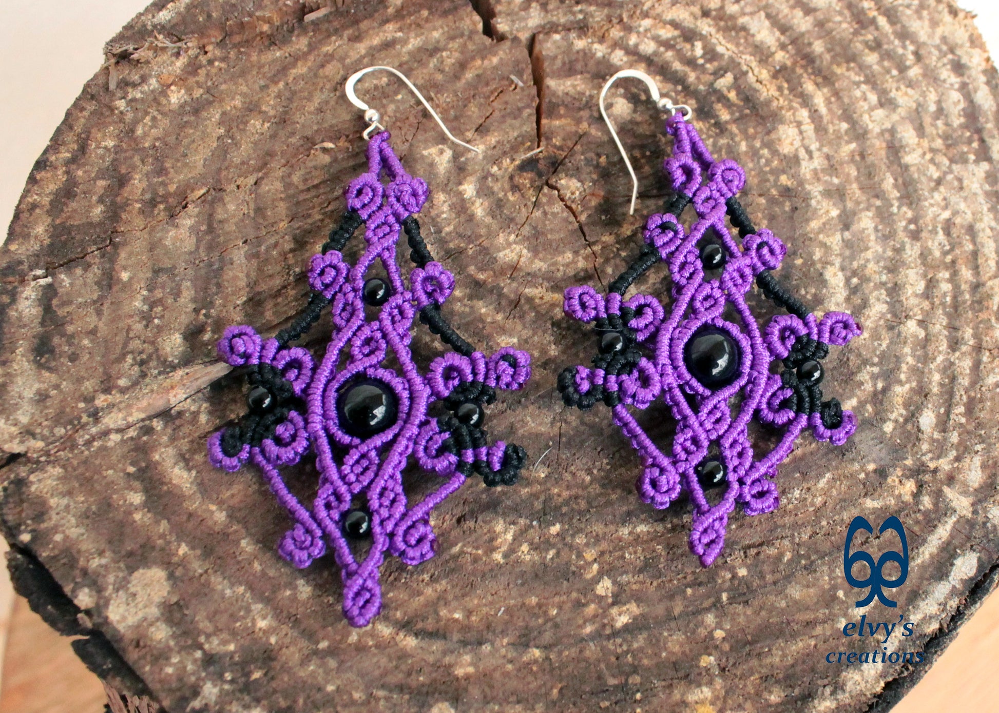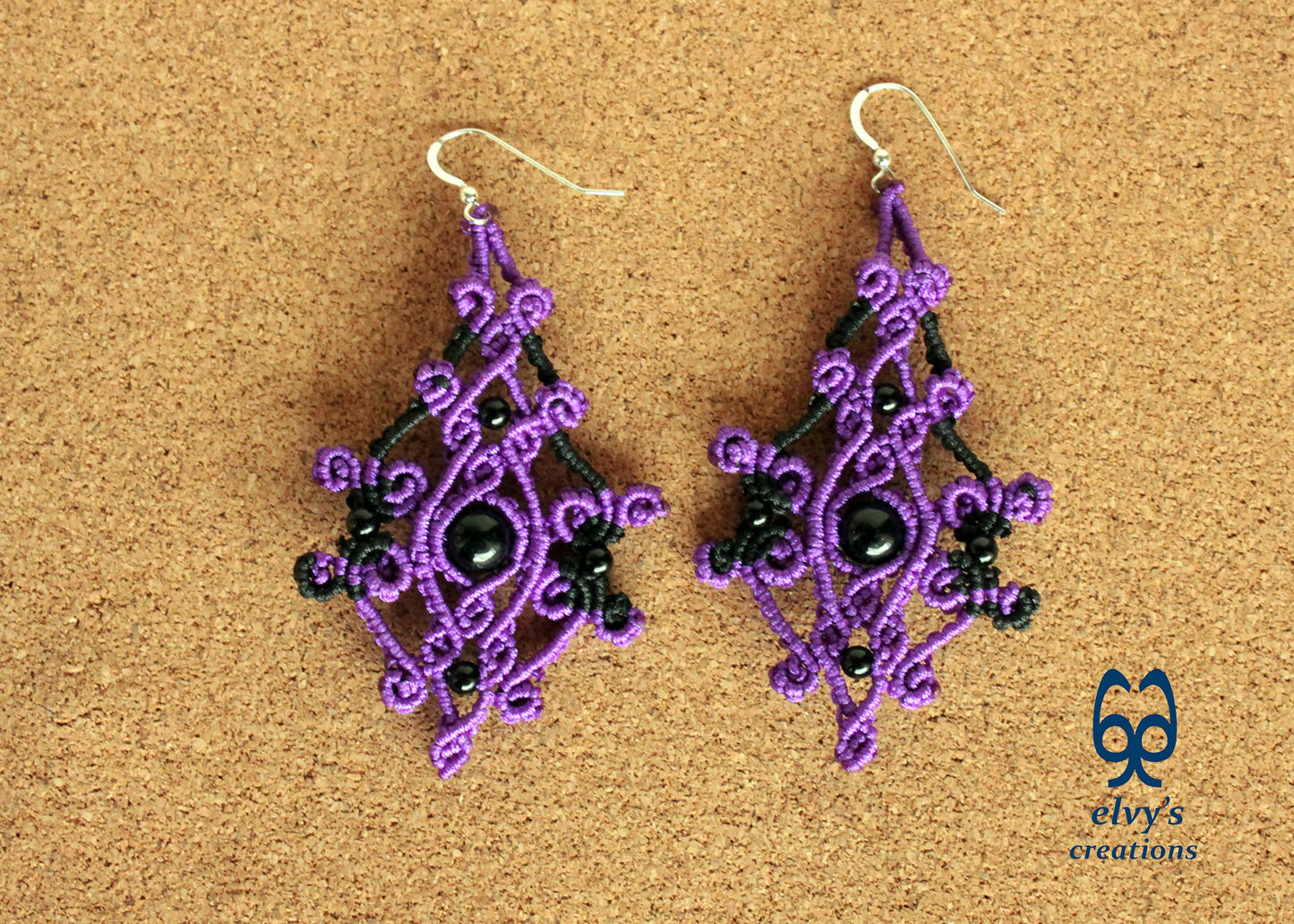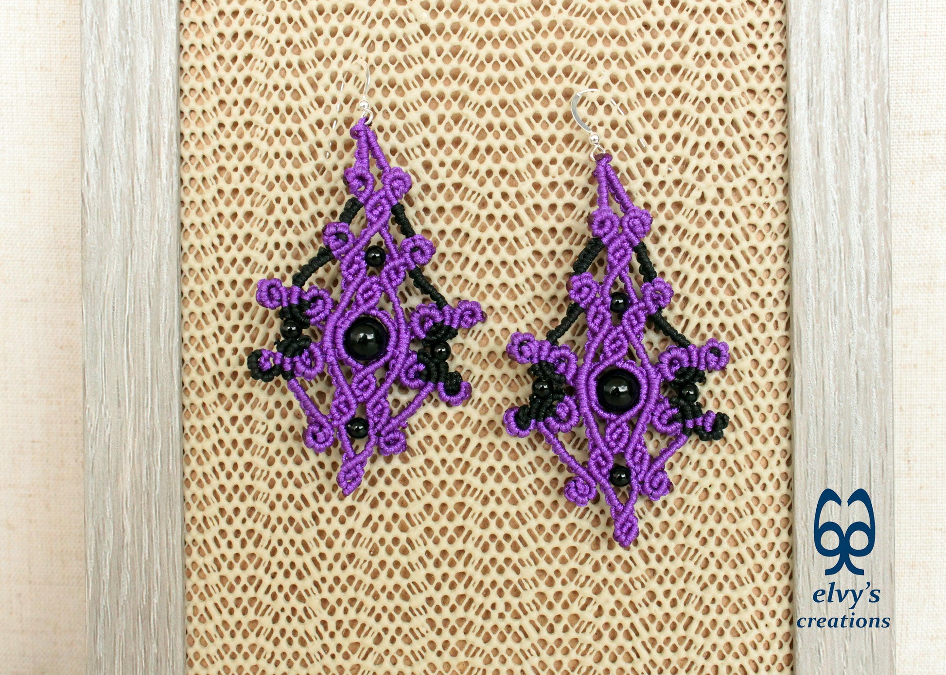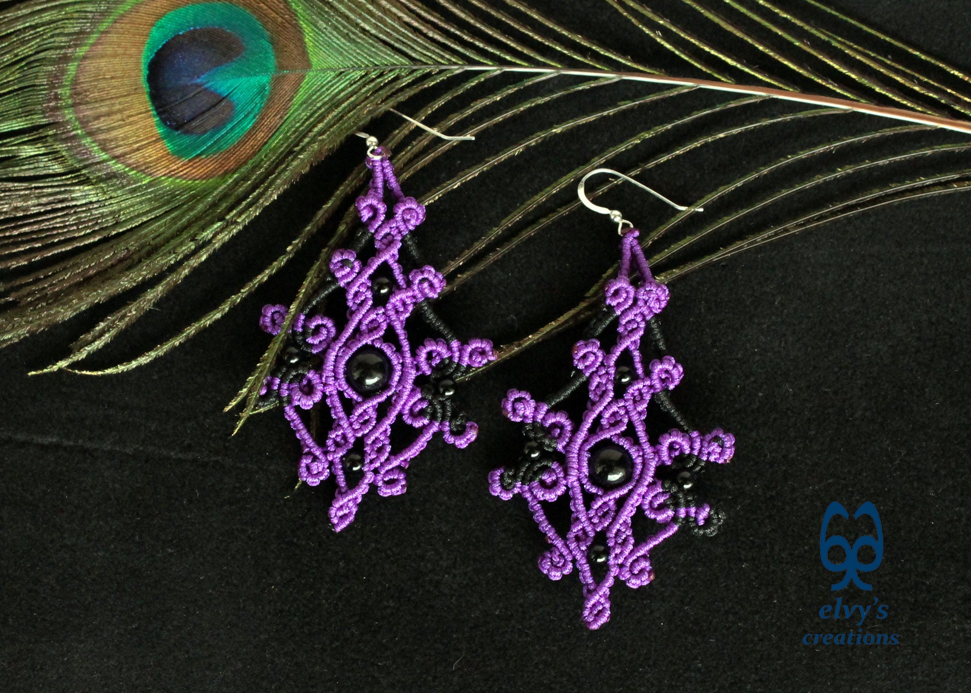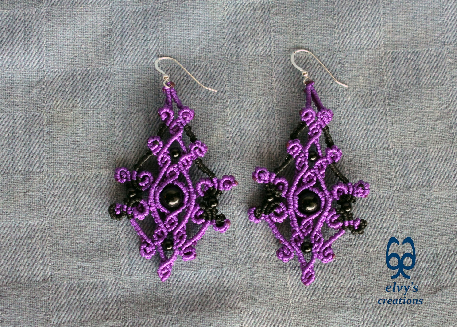 Τα χειροποίητα σκουλαρίκια είναι φτιαγμένα με αδιάβροχο μαύρο και μωβ κορδόνι, χρησιμοποιώντας την τεχνική μακραμέ. Τα σκουλαρίκια είναι διακοσμημένα με Όνυχα, και οι γάντζοι είναι από ασήμι υποαλλεργικό.