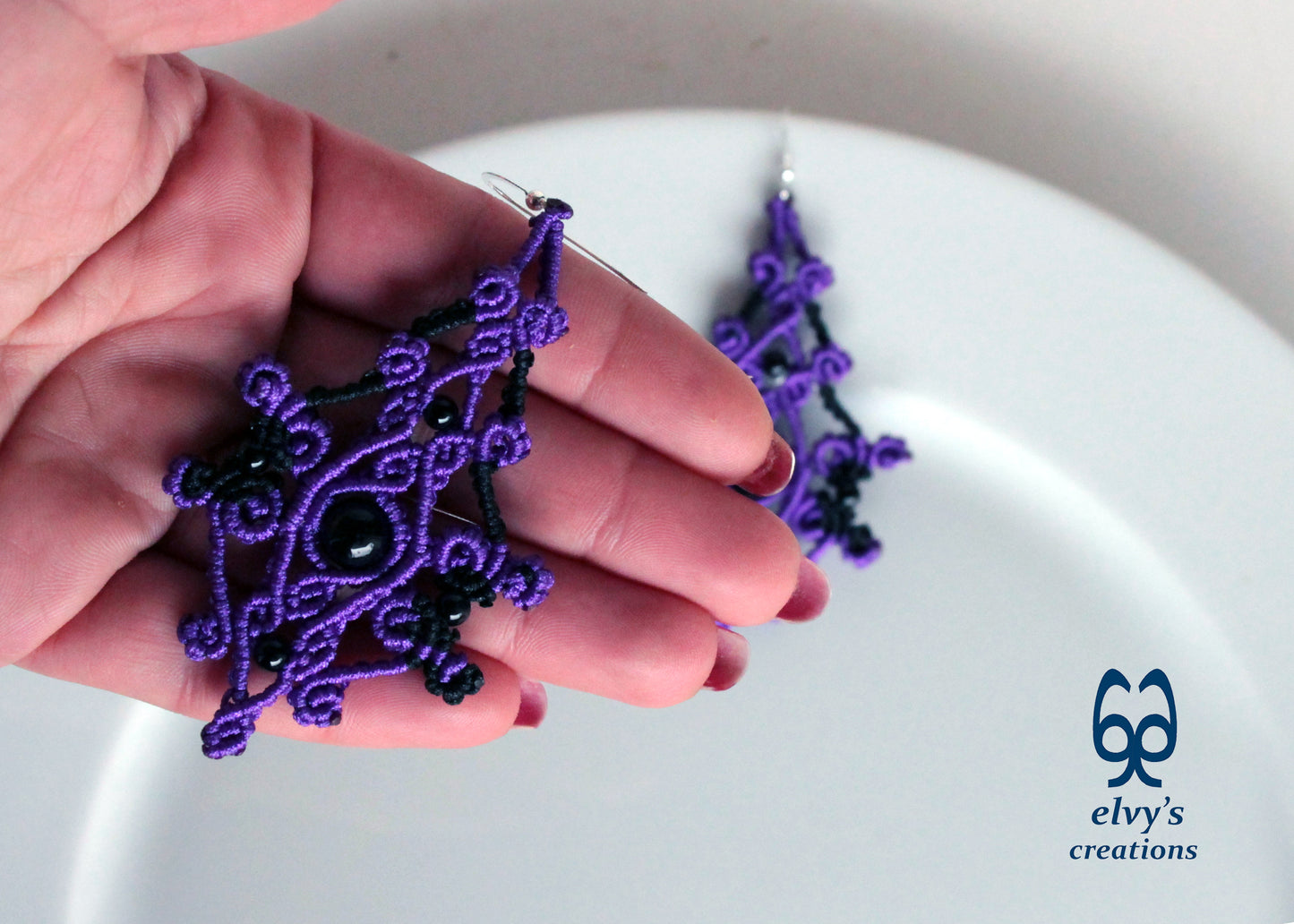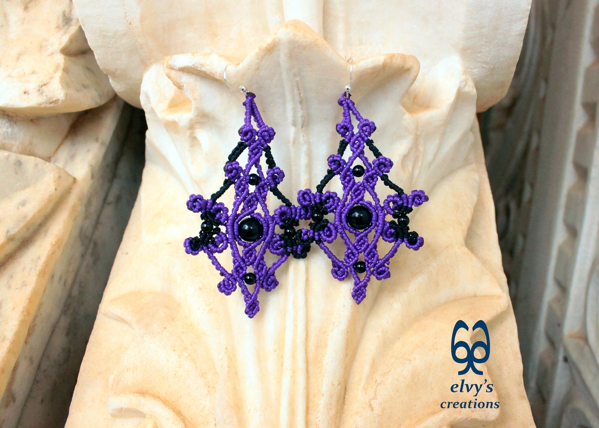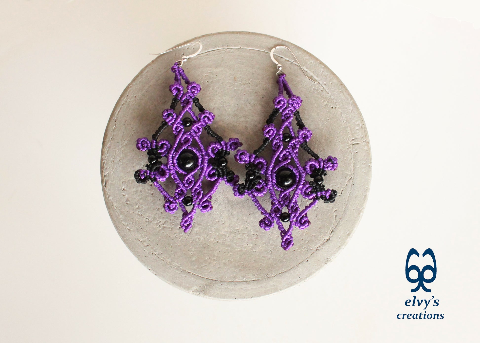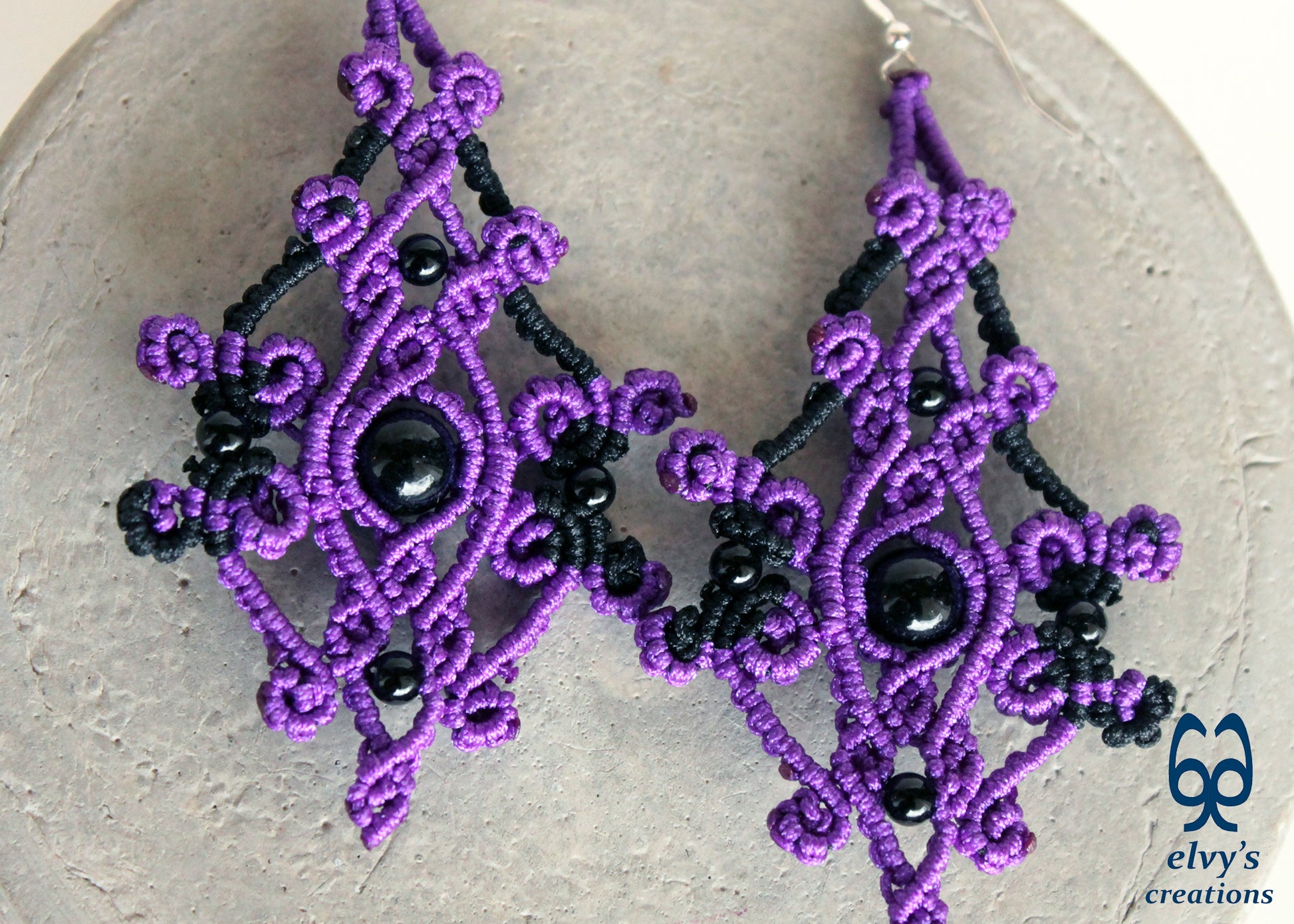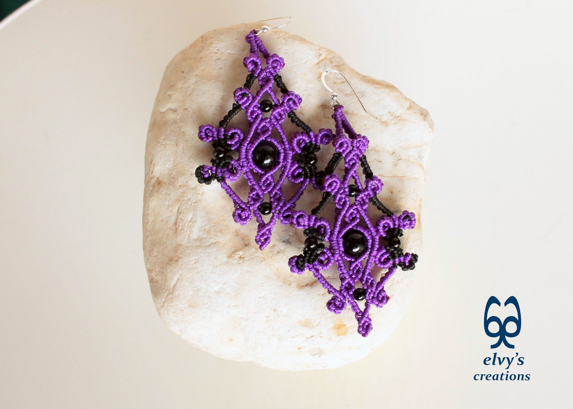 Τα χειροποίητα σκουλαρίκια είναι φτιαγμένα με αδιάβροχο μαύρο και μωβ κορδόνι, χρησιμοποιώντας την τεχνική μακραμέ. Τα σκουλαρίκια είναι διακοσμημένα με Όνυχα, και οι γάντζοι είναι από ασήμι υποαλλεργικό.