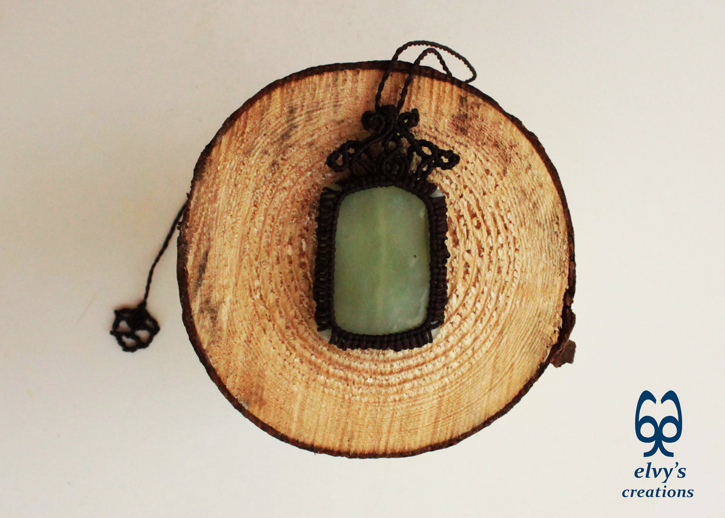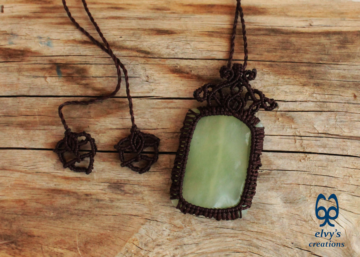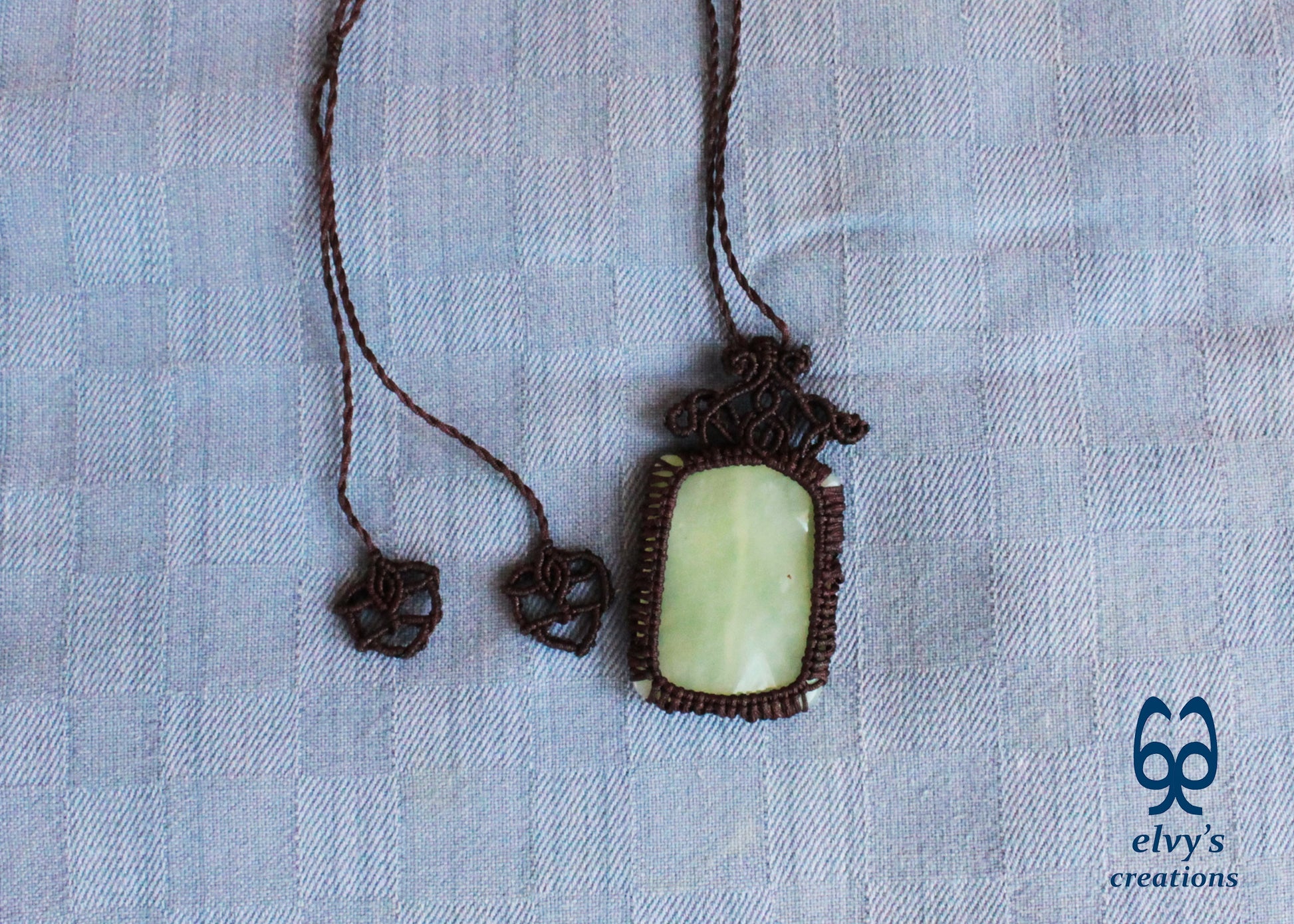 This is a green macramé necklace with Chalcedony gemstones. Handmade with brown macrame cords and it is decorated with stunning lime green Chalcedony gemstone.