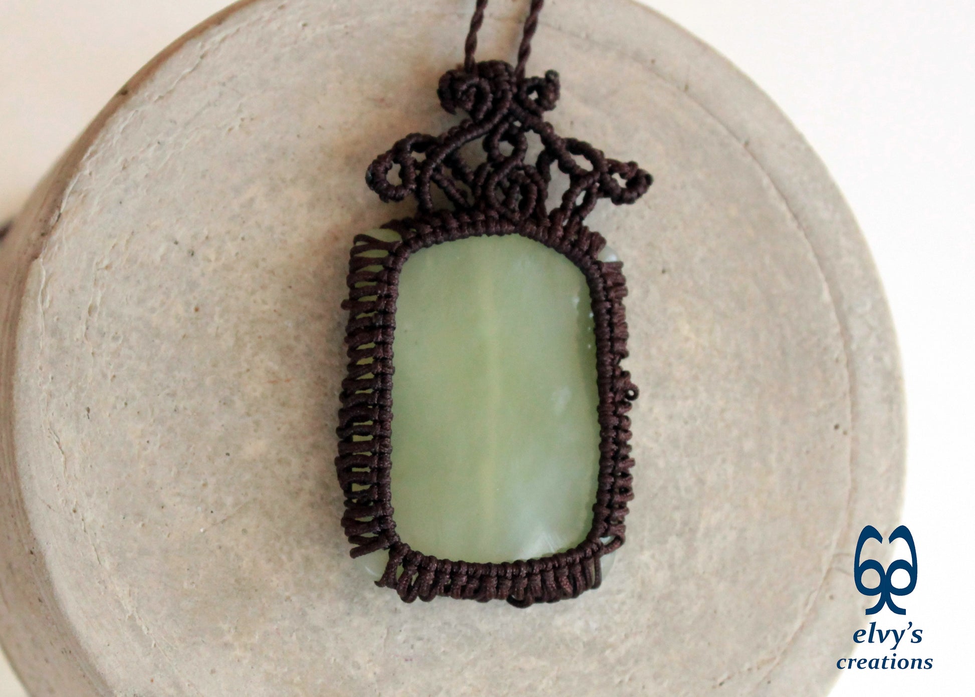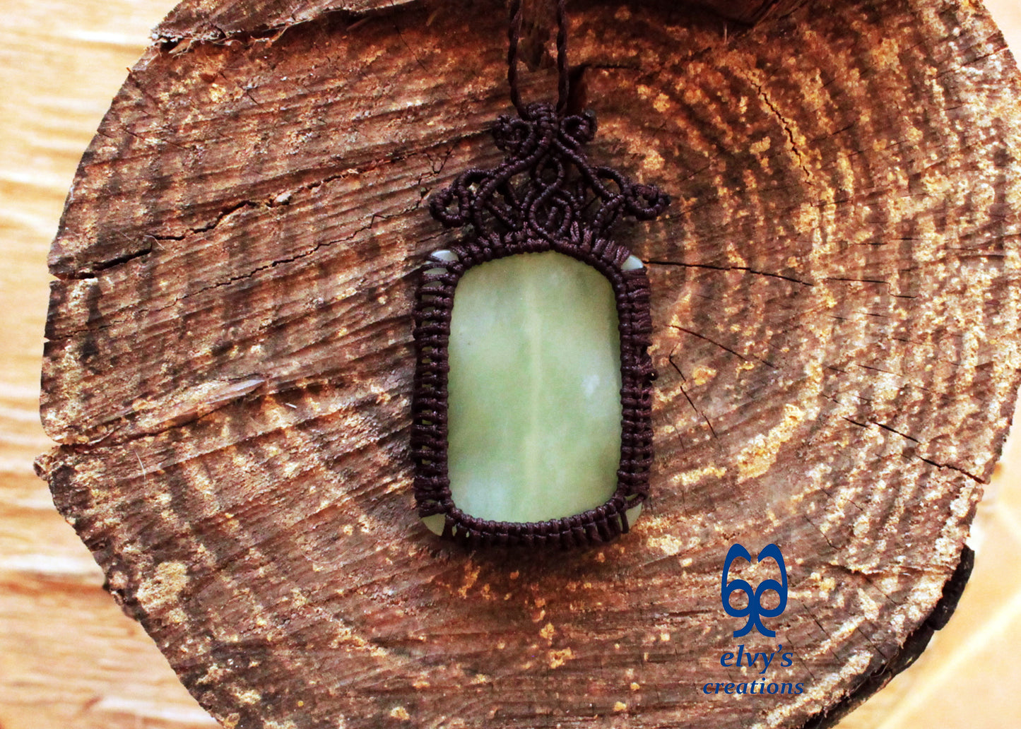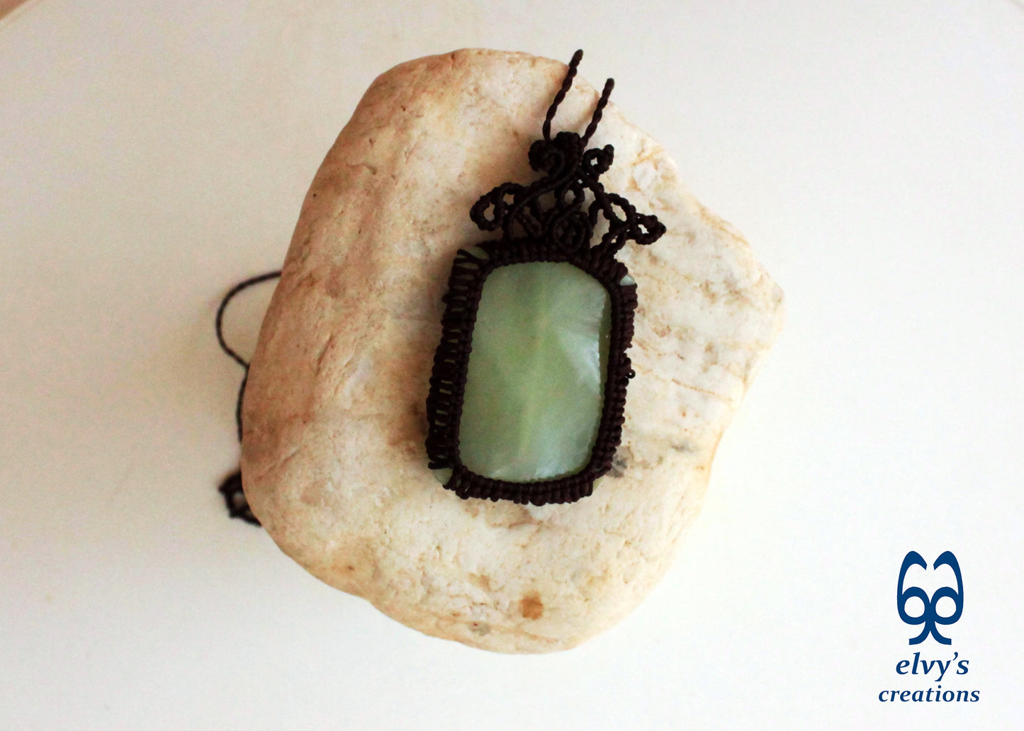This is a green macramé necklace with Chalcedony gemstones. Handmade with brown macrame cords and it is decorated with stunning lime green Chalcedony gemstone.
