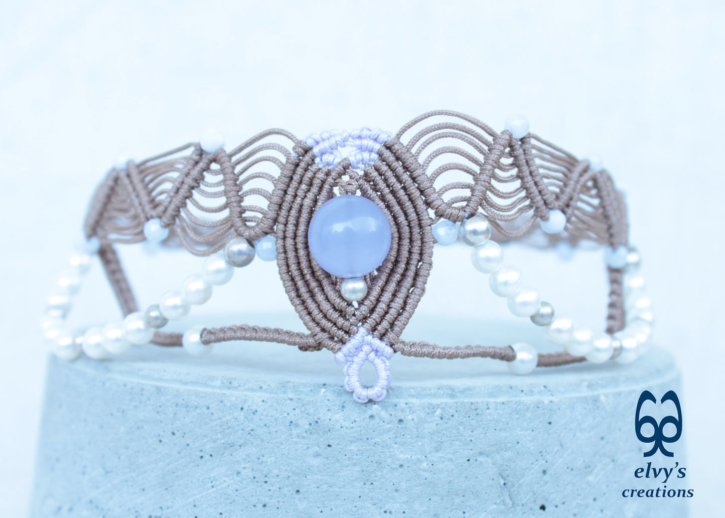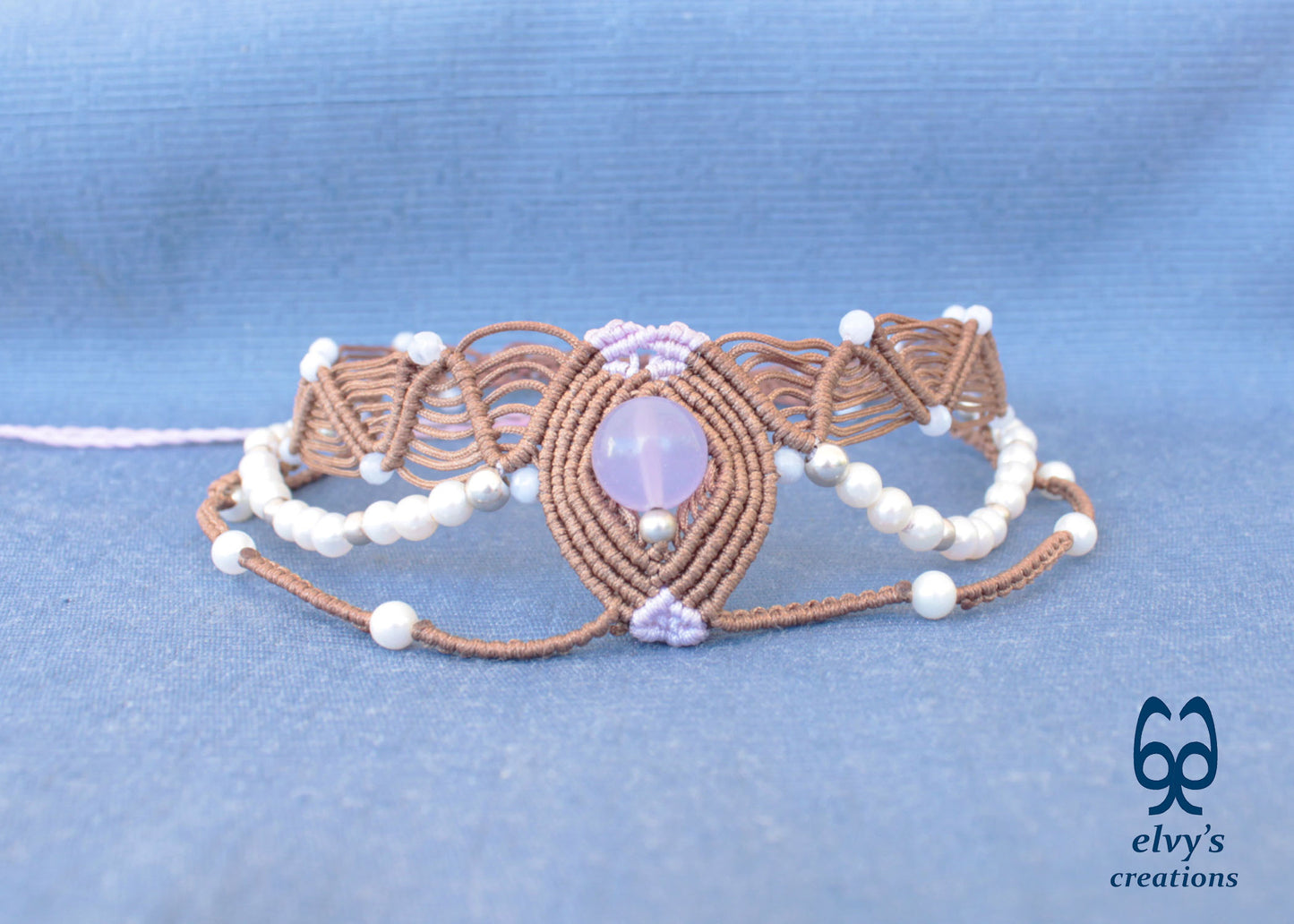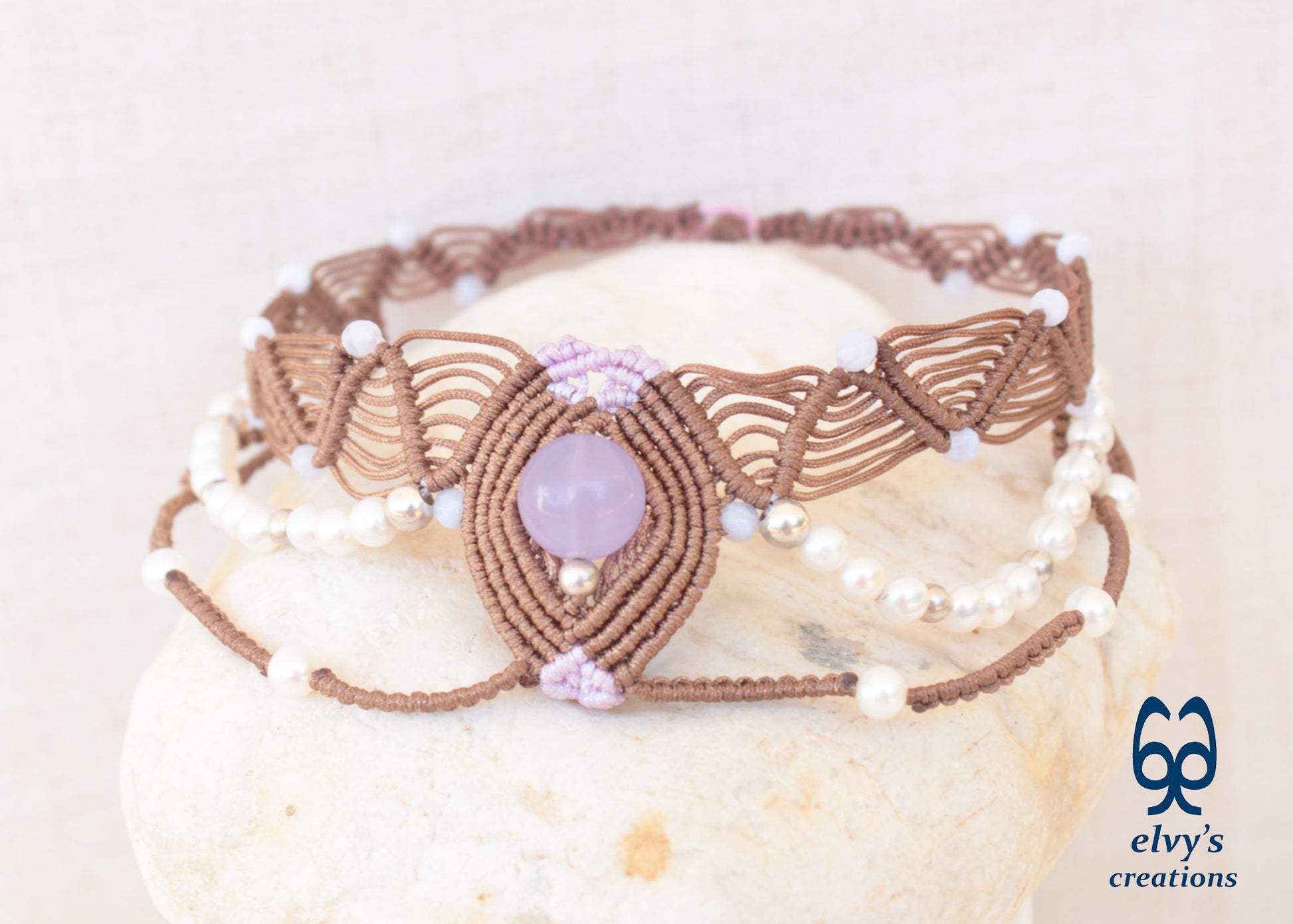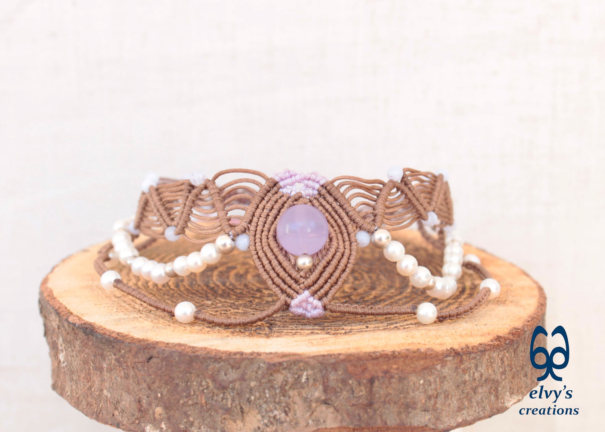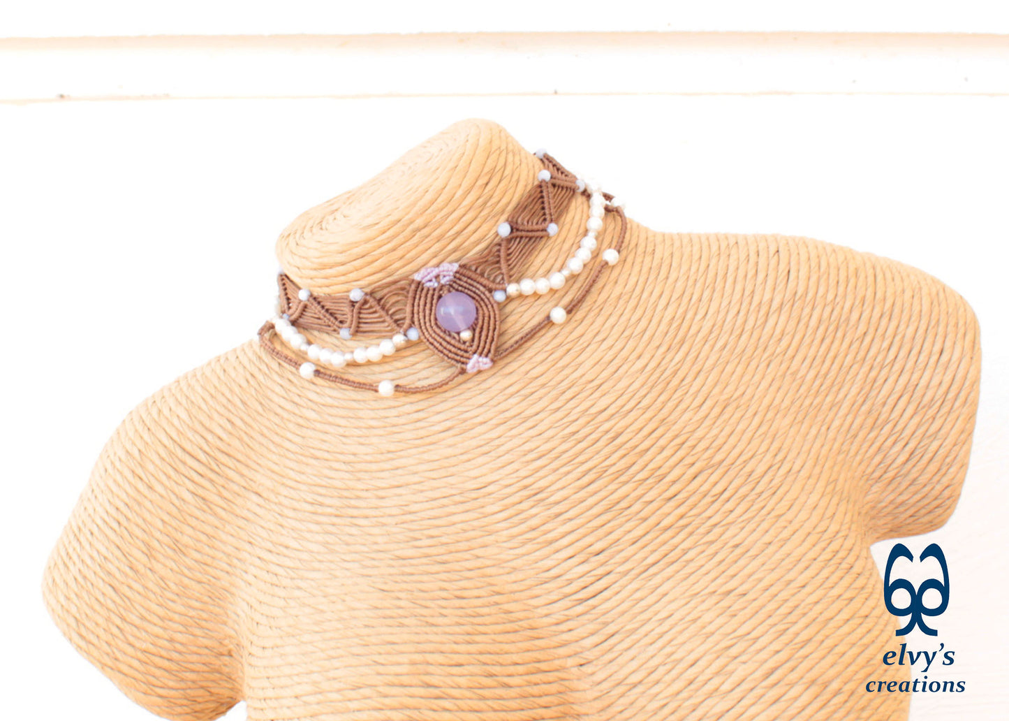 This macramé choker necklace is made with dark beige and light purple waterproof macrame cords. The necklace is decorated with Chalcedony gemstones, natural Pearls, and silver beads.