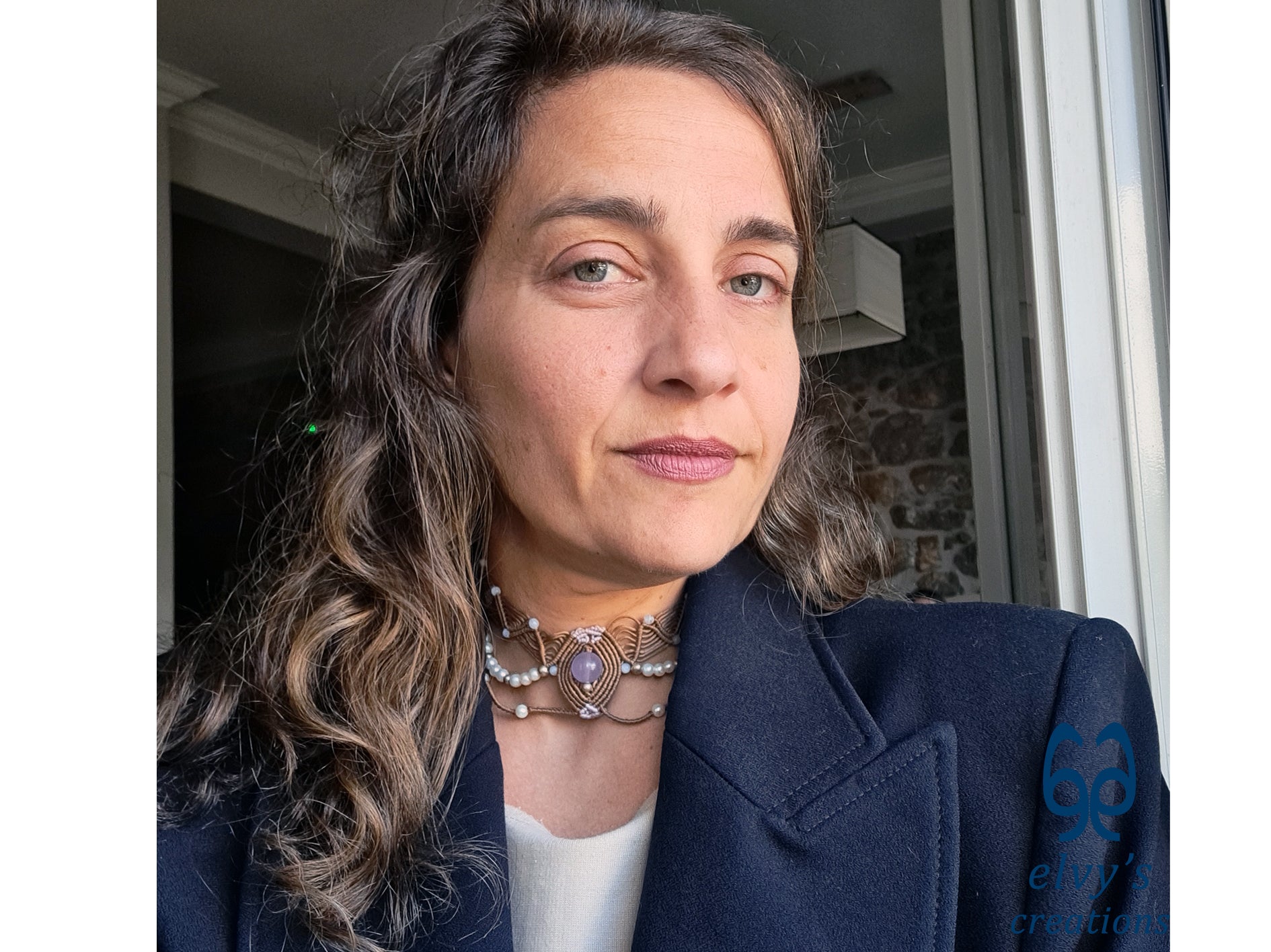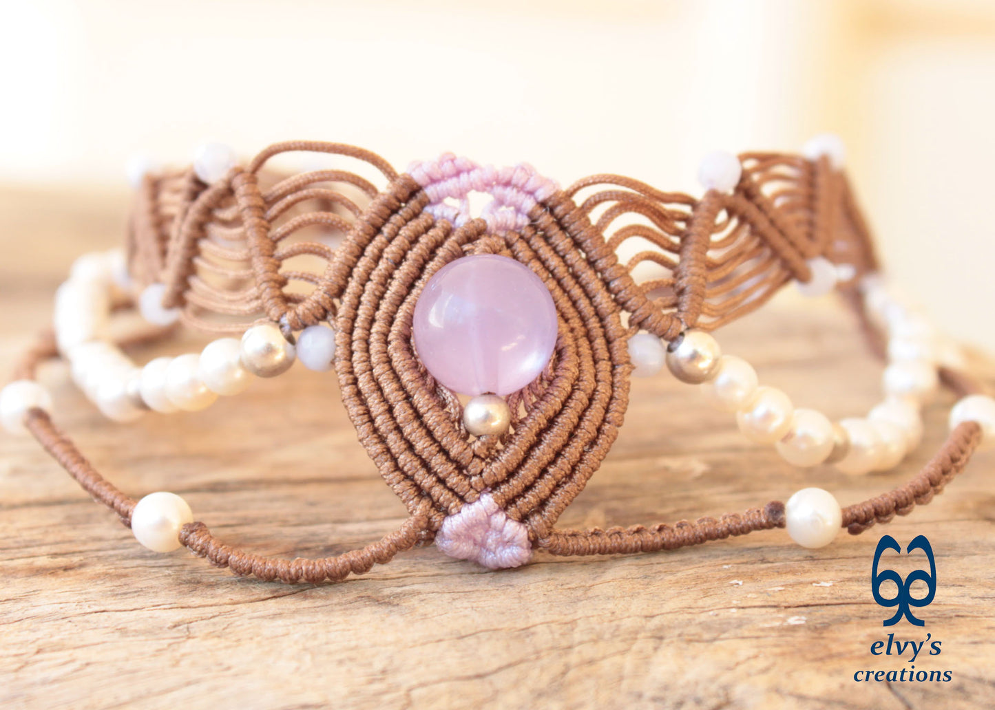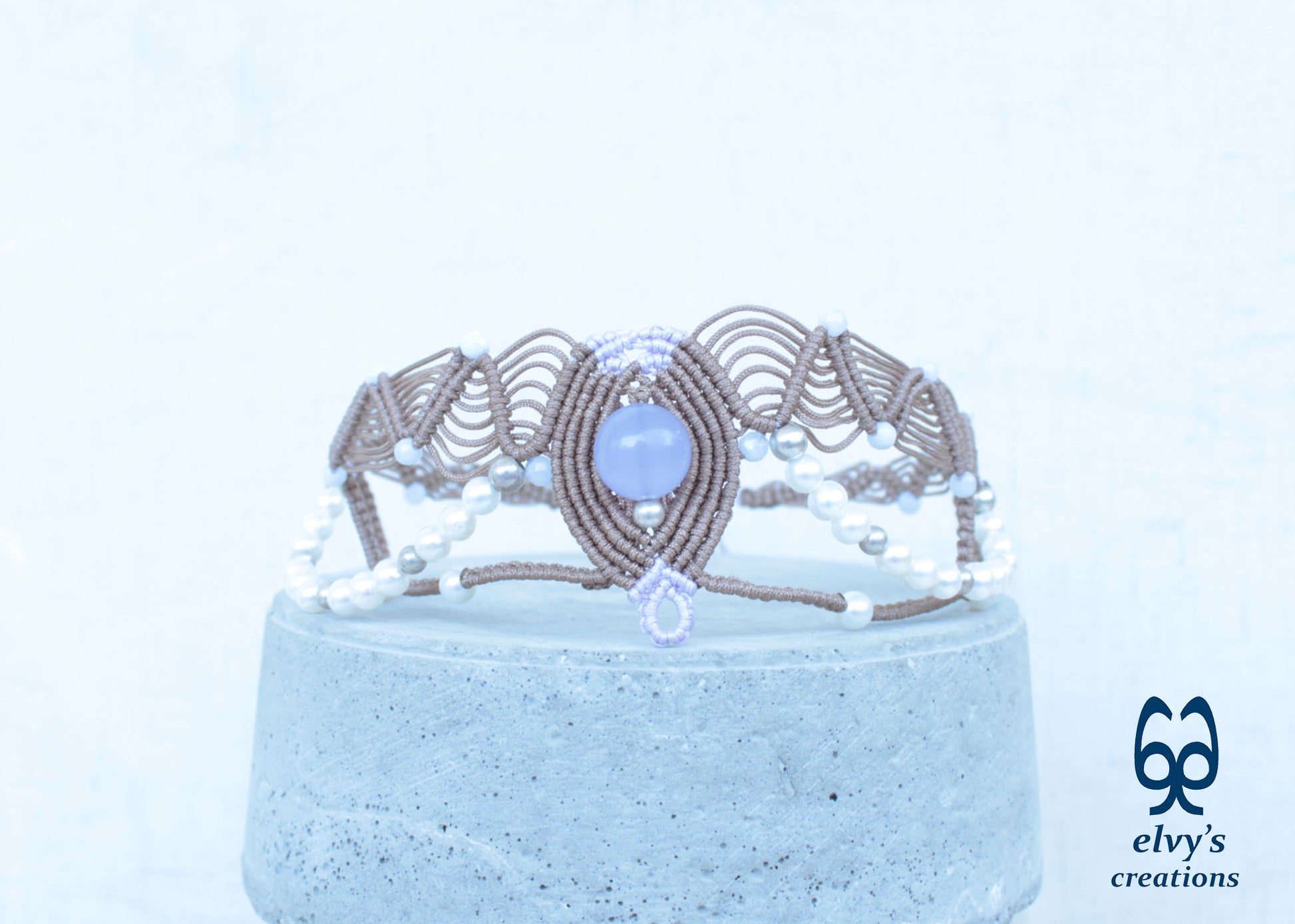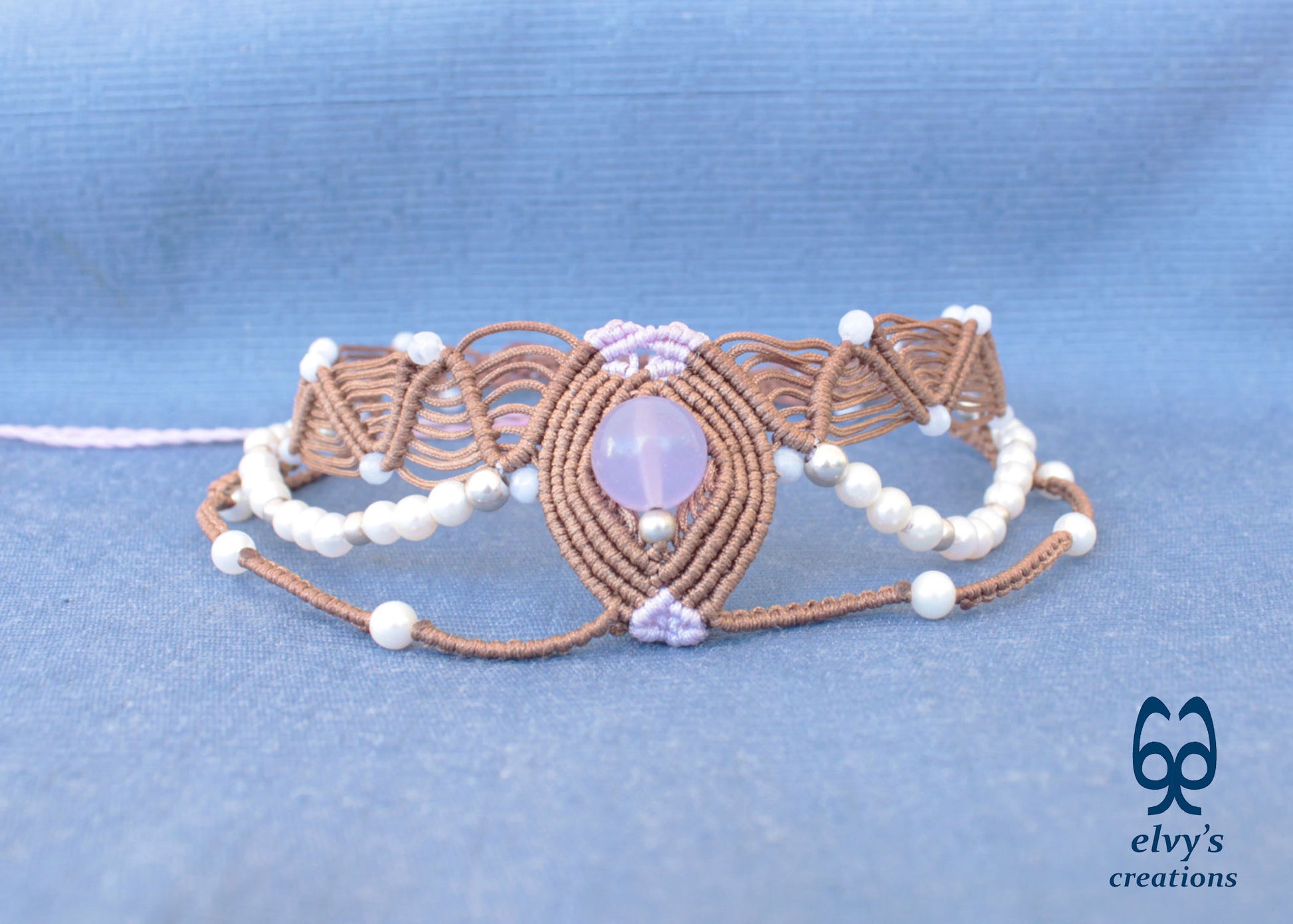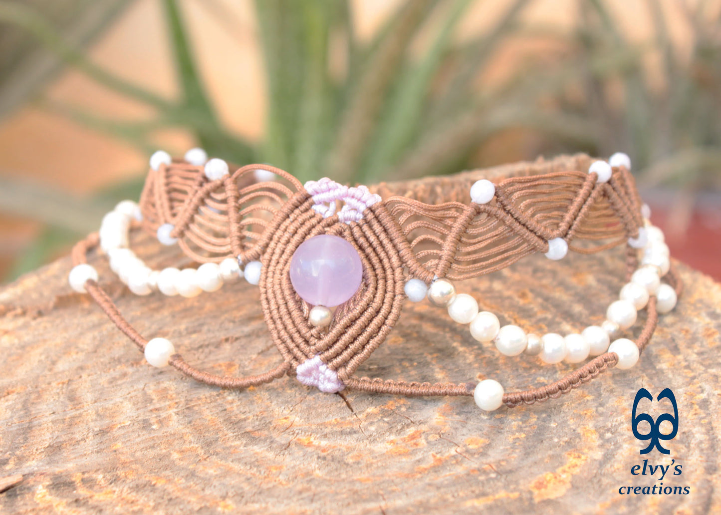 This macramé choker necklace is made with dark beige and light purple waterproof macrame cords. The necklace is decorated with Chalcedony gemstones, natural Pearls, and silver beads.